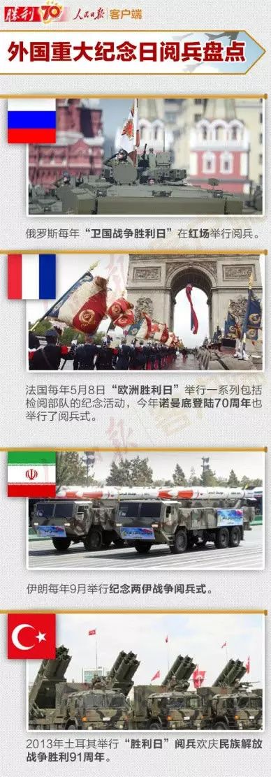 更何況,在重大紀(jì)念日舉辦閱兵式也不是中國(guó)首開(kāi)先河,而是國(guó)際慣例。俄羅斯每年的“衛(wèi)國(guó)戰(zhàn)爭(zhēng)勝利日”都要在紅場(chǎng)舉行閱兵。法國(guó)每年“歐洲勝利日”都會(huì)舉行一系列紀(jì)念活動(dòng),其中就包括檢閱部隊(duì)。伊朗每年9月都會(huì)舉行紀(jì)念兩伊戰(zhàn)爭(zhēng)閱兵式。