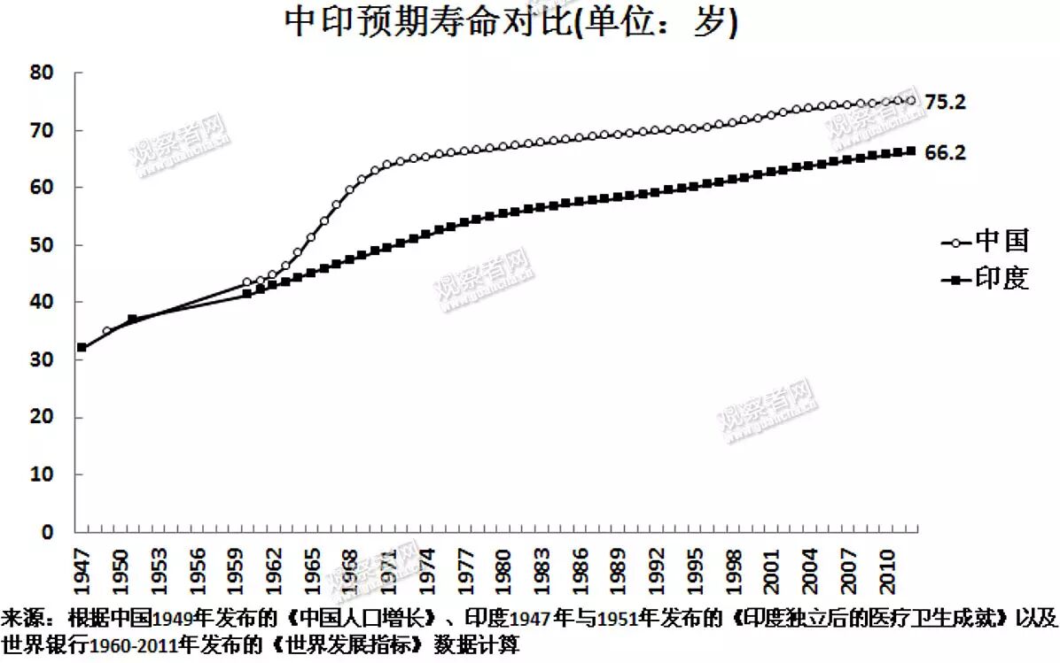 相比之下,在印度取得獨(dú)立27年后,印度人的預(yù)期壽命只增加了19歲。因此,中國(guó)這一時(shí)期的發(fā)展成就非但不是負(fù)面的,而是歷史上最偉大的社會(huì)成就之一。”
