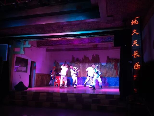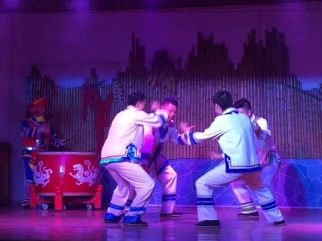 舞臺(tái)上恢弘的大鼓敲了起來,演員們豪邁的踩著鼓點(diǎn)邊唱邊跳,不時(shí)的變換著隊(duì)形和節(jié)奏,可謂是既有氣勢(shì)又帶著一絲放蕩不羈的味道,鼓點(diǎn)與唱腔讓人聯(lián)想起只身打馬過草原的灑脫與落寞。這種表演叫撒葉兒嗬,是清江流域中游土家族的一種靈堂祭祀歌舞,也是國家級(jí)非物質(zhì)文化遺產(chǎn)。