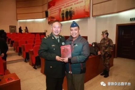 (雷納爾多·加比內特中校拿著英文版《告訴你一個真實的雷鋒》與陶克將軍合影留念)