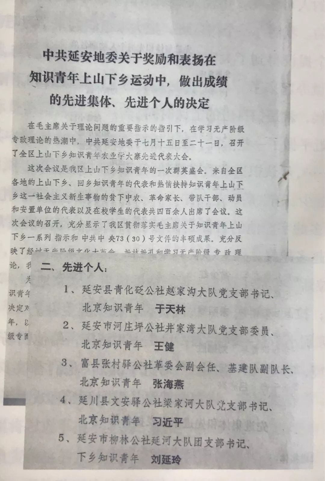 1975年7月15日,中共延安地委召開上山下鄉(xiāng)知識(shí)青年學(xué)大寨先進(jìn)代表會(huì),習(xí)近平等14名北京知青作為先進(jìn)個(gè)人受到通報(bào)表?yè)P(yáng)