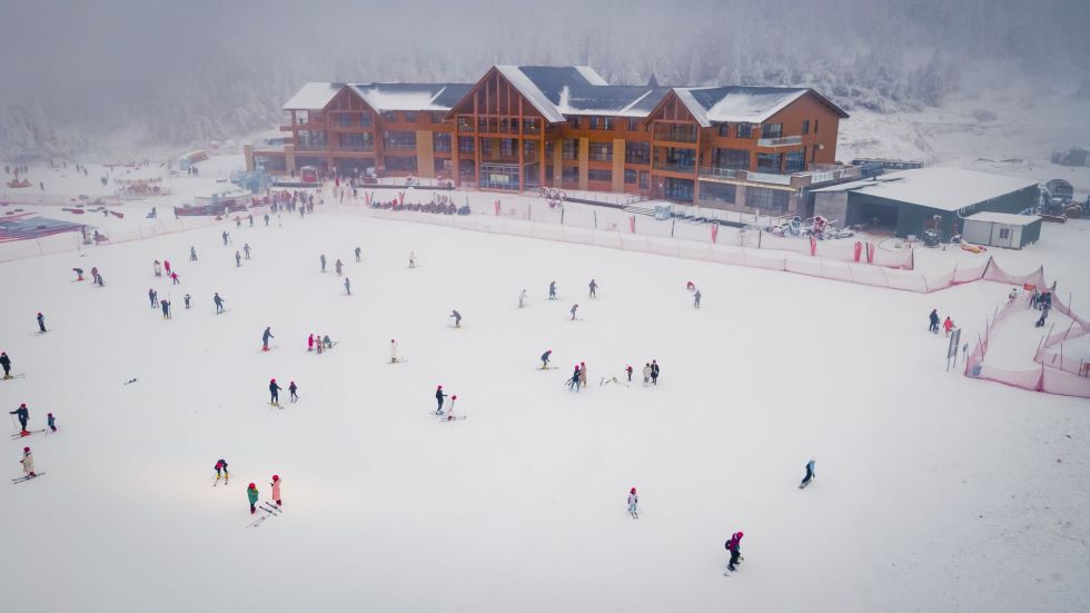 ↑游客在重慶豐都縣南天湖國際滑雪場體驗(yàn)冰雪運(yùn)動(dòng)(2021年1月9日攝)。