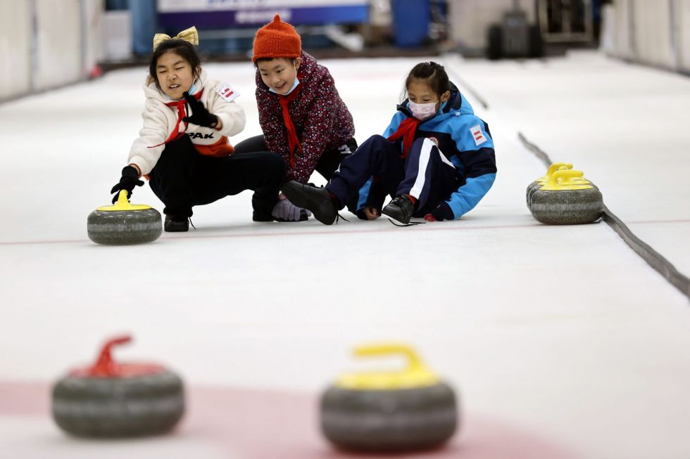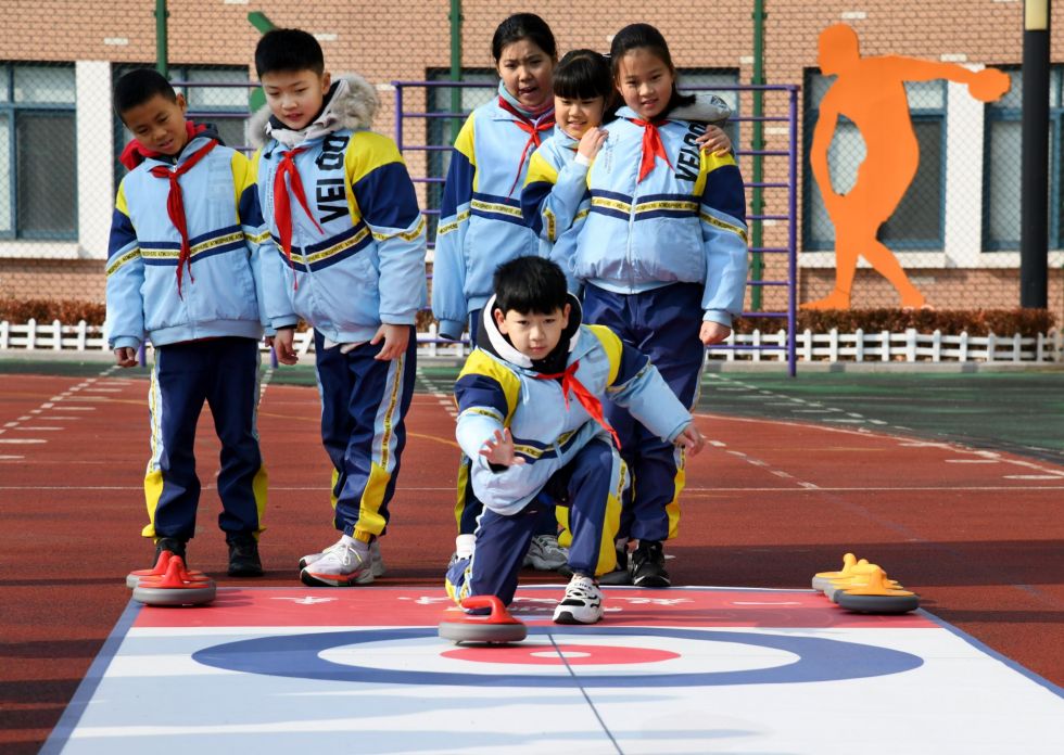 ↑在上海市黃浦區(qū)盧灣青少年業(yè)余體育學(xué)校,盧灣一中心小學(xué)的學(xué)生在學(xué)習(xí)冰壺課程(2021年12月8日攝)。