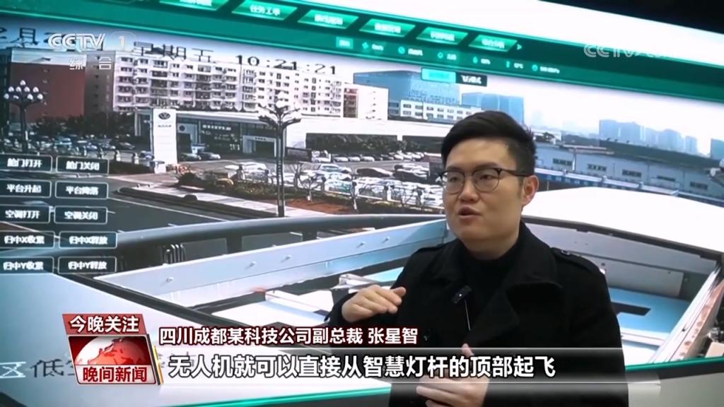 成都某科技公司副總裁 張星智:智慧燈桿的頂部加了無人機(jī)的機(jī)槽。在這個機(jī)槽里面,無人機(jī)就可以直接從智慧燈桿的頂部起飛,然后采集城市的相關(guān)數(shù)據(jù),進(jìn)行數(shù)據(jù)的治理分析。